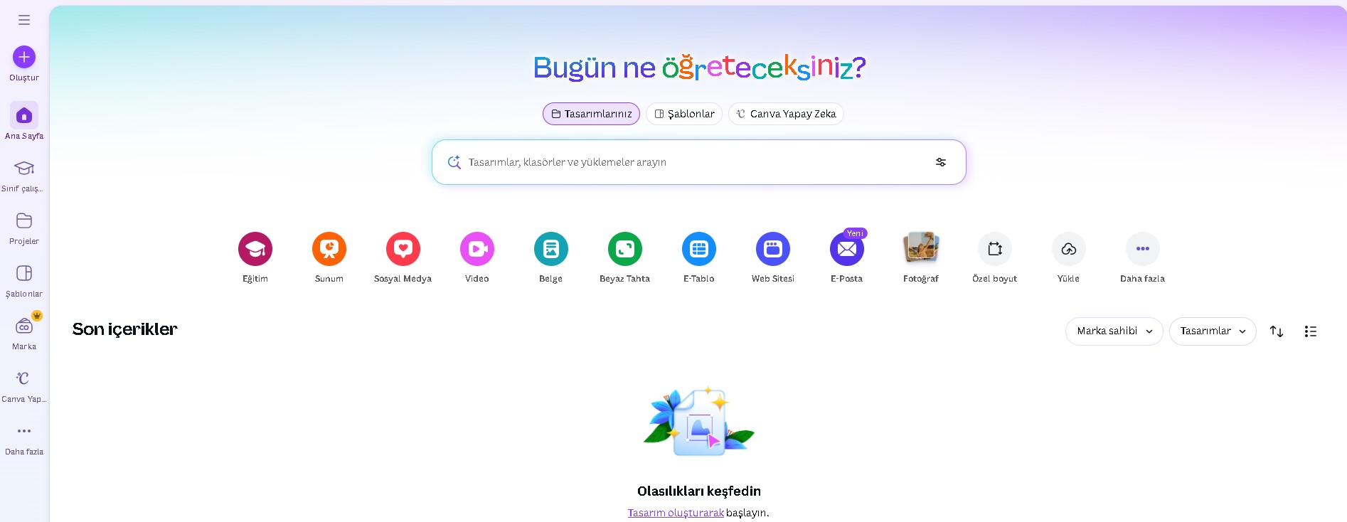 Canva sitesine giriş yaptığınızda sizi aşağıdaki gibi bir sayfa karşılayacak.