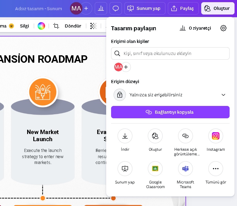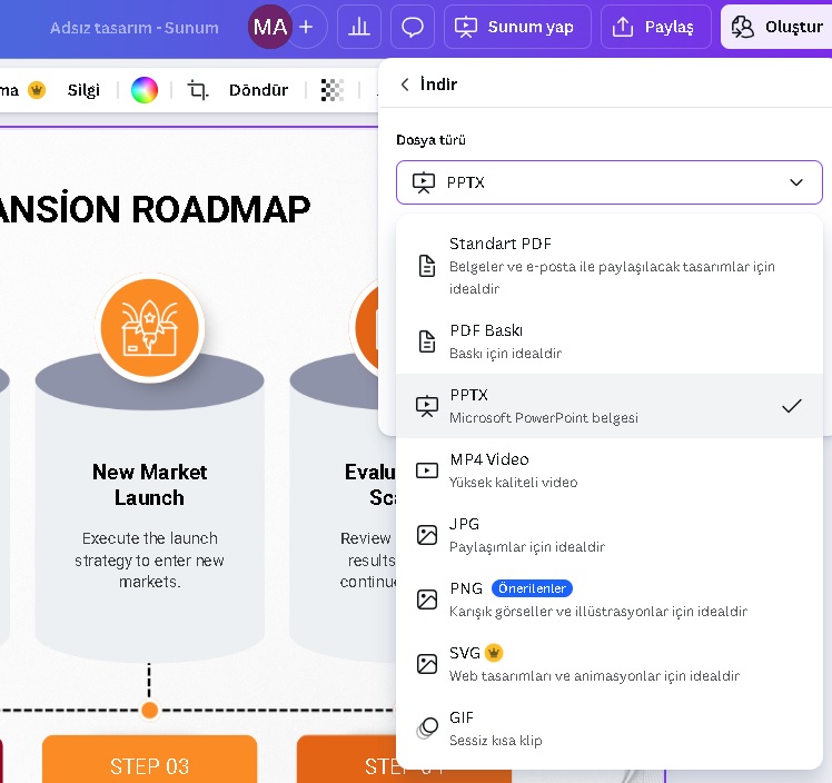 “İndir” seçeneğinden hangi formatta indirmek istiyorsak seçerek, bilgisayarımıza oluşturduğumuz tasarımı indirebiliriz.