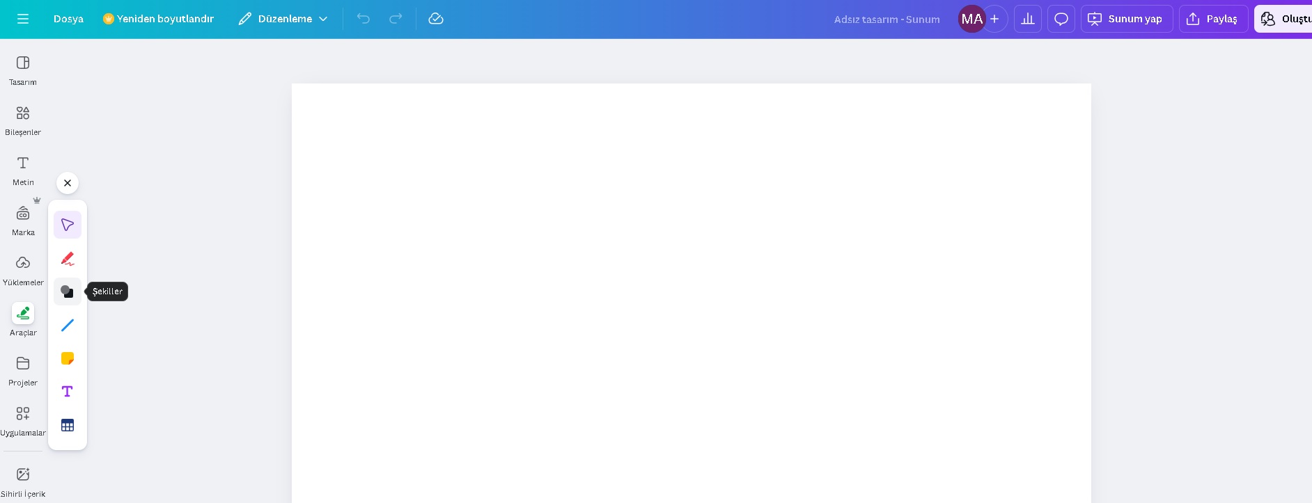 Araçlar Kısmında tasarımınıza ekleyeceğiniz çizim, şekiller, çizgiler, yapışkan notlar, tablolar bulabilir. Tasarımınıza ekleyebilir ve düzenleyebilirsiniz.