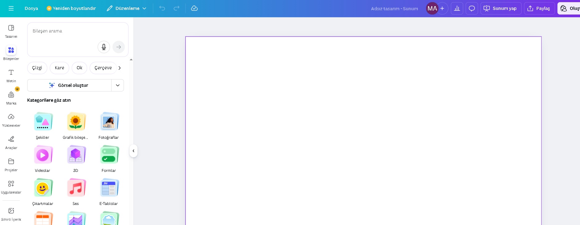 Bileşenler kısmında Canva’ nın tasarımlarınız için size sunduğu Şekiller, Çıkartmalar, Tablolar, Video ve sesler gibi bileşenler bulabilir, bunları tasarımlarınıza ekleyebilirsiniz.