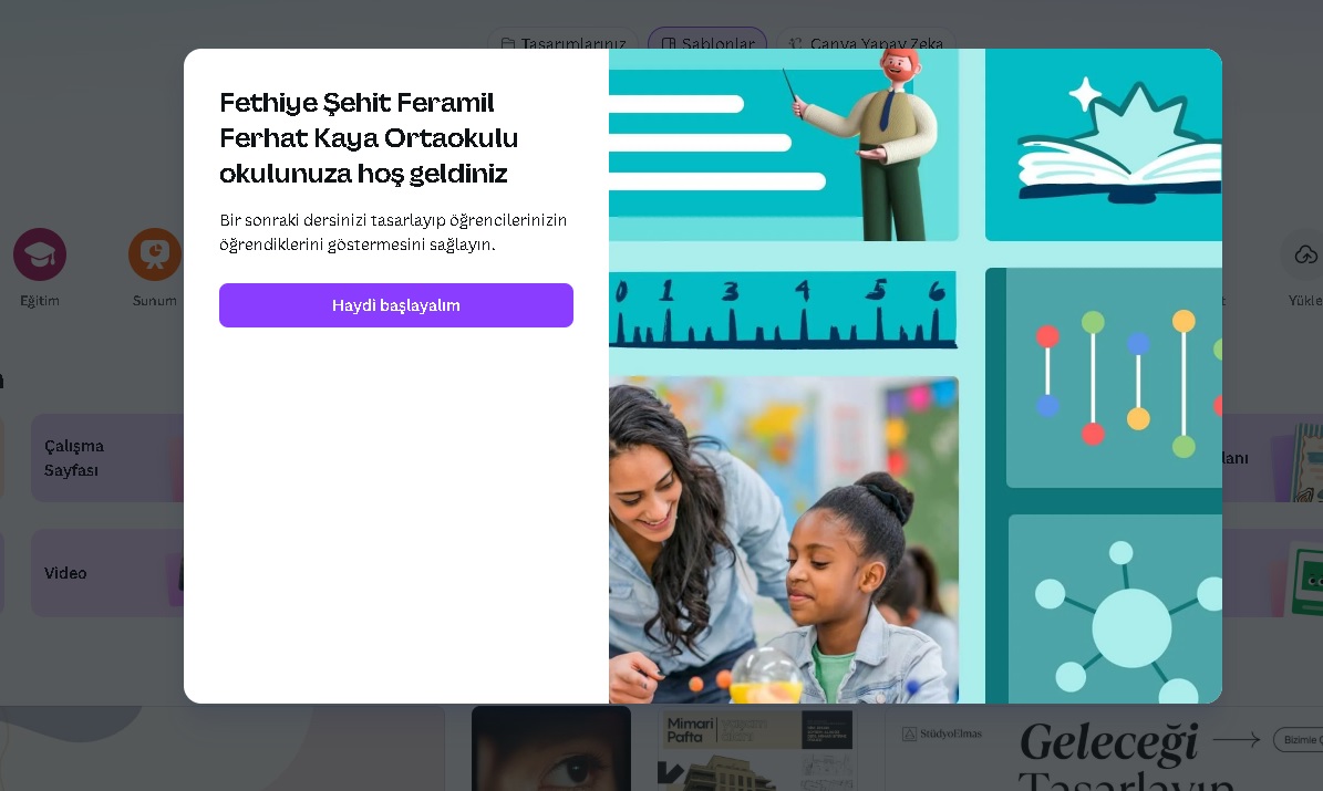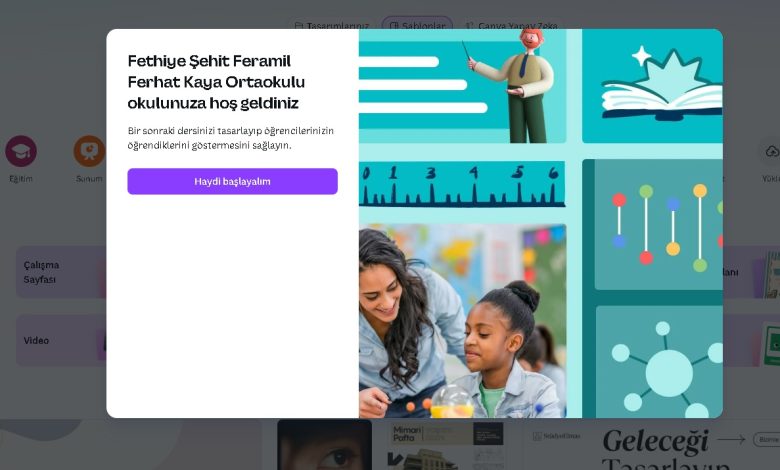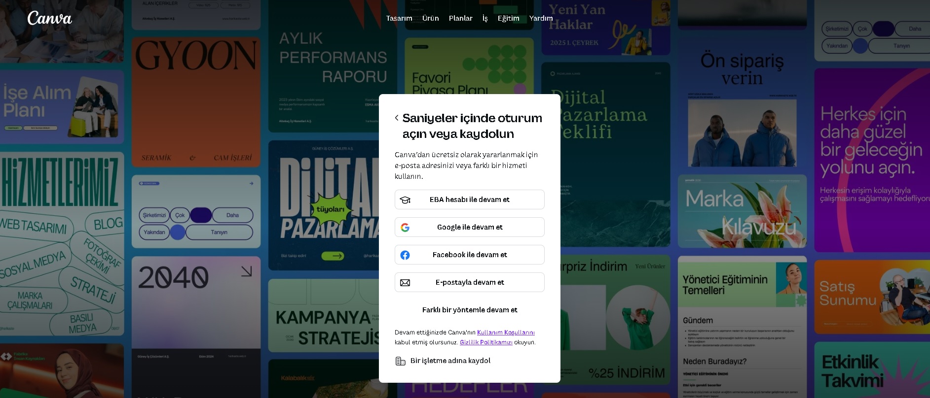 Mail adresinizle girebileceğiniz gibi EBA hesabınızla veya öğretmeninizin size gönderdiği bağlantı ve kodla kendi okulunuzun grubuna dahil olarak, Canva’ yı tüm özellikleriyle ücretsiz olarak kullanabilirsiniz.
