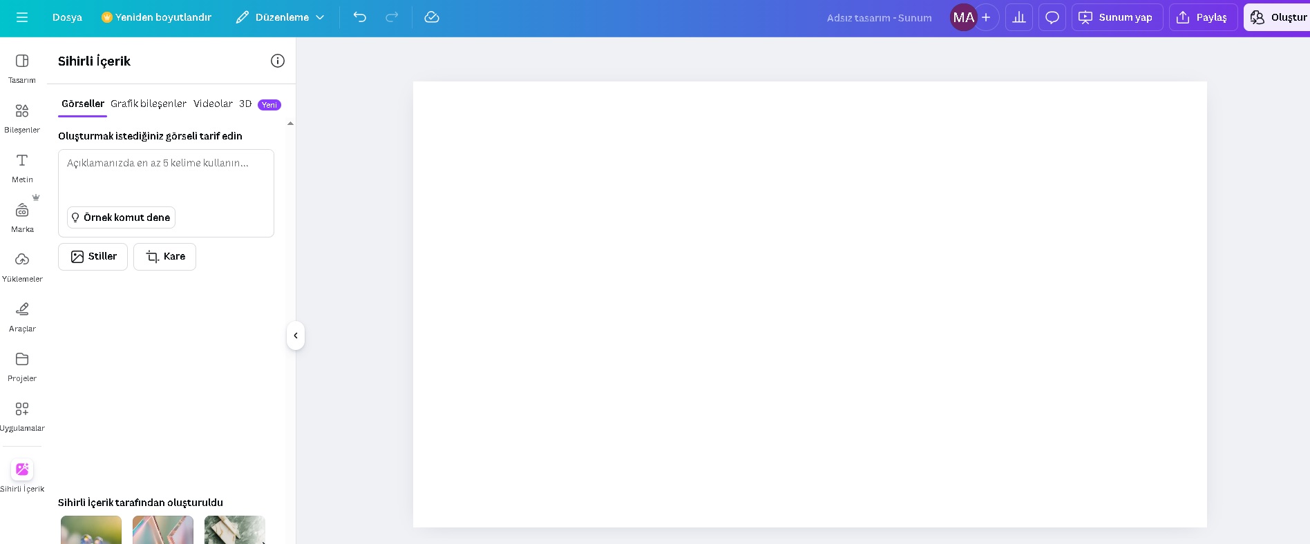 Sihirli İçerik kısmından Canva yapay zeka aracını kullanarak görsel, videolar oluşturabilirsiniz.