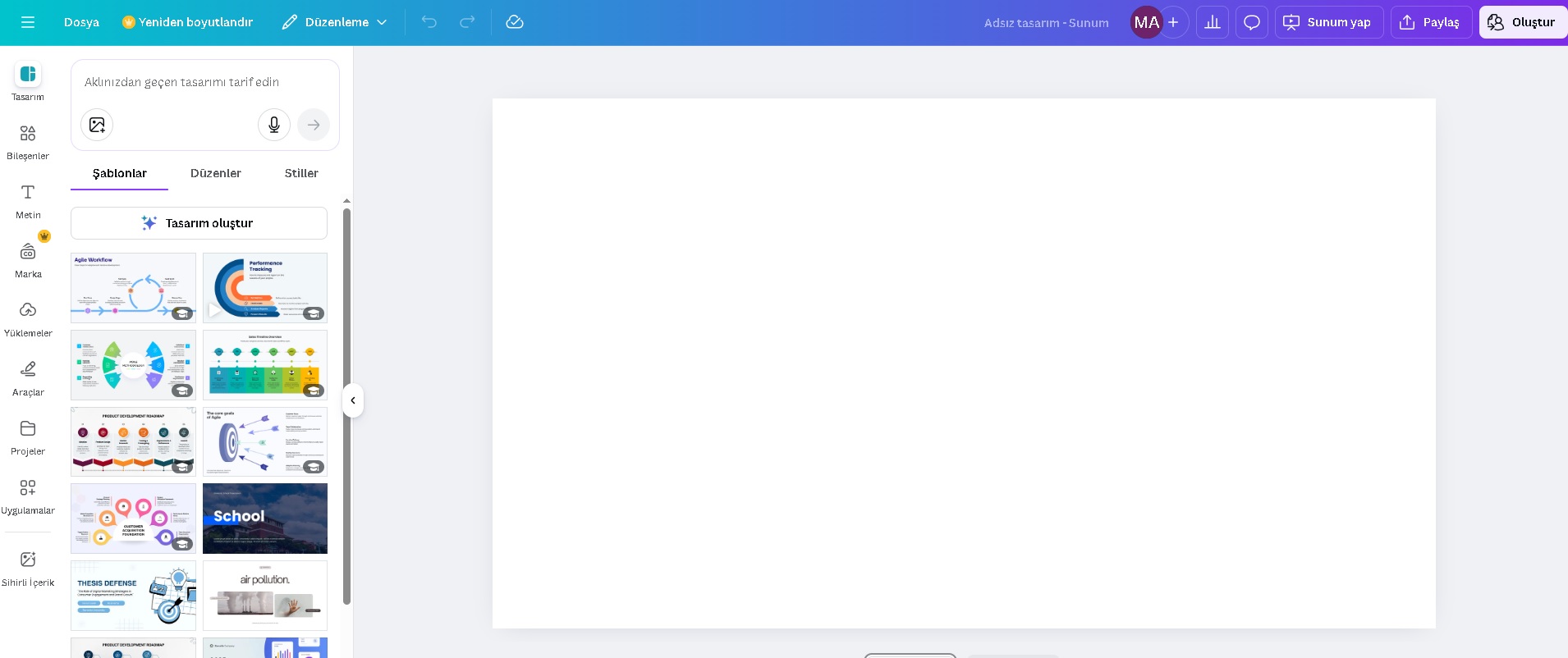 Tasarım kısmında örneğin bir sunum hazırlayacak olalım. Şablonlar sekmesinde sizin için önceden hazırlanmış sunum şablonlarına ulaşabilirsiniz. Bunlar üzerinde değişiklik yaparak hızlıca bir sunum tasarlayabilirsiniz.