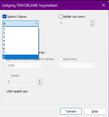 ekrana gelen “Gelişmiş Önyükleme” penceresindeki işlemci sayısını en yüksek değer olarak seçip, Tamam düğmesine tıklayın.